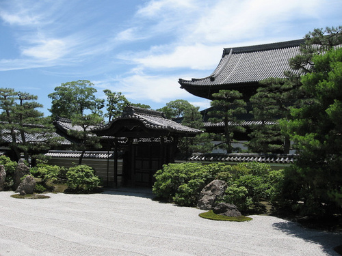 (日本京都建仁寺,如同中國的白馬寺,建仁寺是日本第一座千年寺廟。內部的枯海庭園造景、沒有被名畫家落款的風雷神的名畫、從上而下捲襲而來的凶猛威武之飛龍繪畫,都是日本國A級的重要文化財產。很可惜第一次去京都遊玩的台灣旅客並不會去這裡,而是去素享盛名的清水寺、金閣寺、東本院寺等等。我們入廟門常看到門上寫著入「不二門」。也常聽到「不二法門」這句成語。兩者都源自佛教的中道思想。)